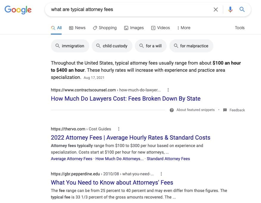 For example, a featured snippet appears for the keyword “what are typical attorney fees”: